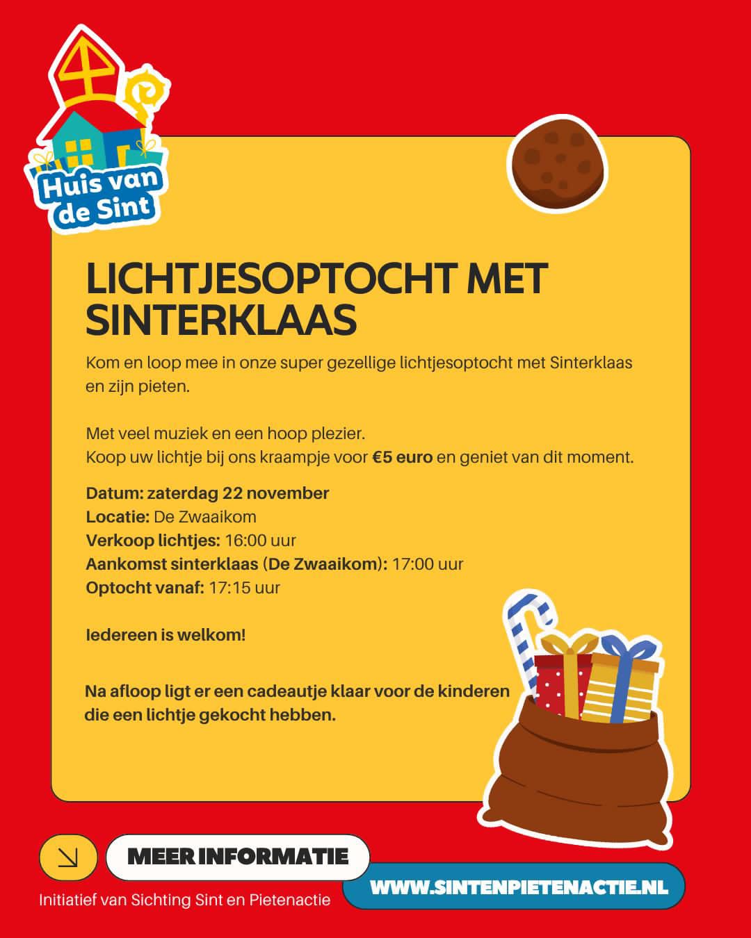 Een week later op zaterdag 22 november is de sfeervolle lichtjesoptocht. Net als voorgaande edities start deze in de Zwaaikom te Katwijk aan Zee. Het meelopen met de tocht wordt natuurlijk nog leuker met een eigen lichtje, deze zijn vanaf 16.00 uur verkrijgbaar voor 5 euro bij een van de kraampjes. Betaling per pin heeft de voorkeur, maar cash afrekenen is ook nog altijd mogelijk. De opbrengst van de verkoop, komt ten goede aan het donatiefonds van Stichting Sint en Pietenactie. Rond 17.00 uur wordt de aankomst van Sint per boot verwacht, ca. een kwartier later start de vrolijk verlichte tocht door het dorp. Ervaring leert dat de tocht voor de allerkleinste deelnemers best een lange route is, advies is dan ook om te zorgen voor een buggy, bolderwagen of sterke schouders.